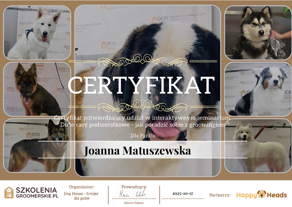 Regularnie poszerzam swoją wiedzę i umiejętności, uczestnicząc w kursach i szkoleniach groomerskich. Zdobyte certyfikaty potwierdzają moje zaangażowanie i profesjonalne podejście do pielęgnacji zwierząt. Dzięki temu mogę zapewnić najwyższą jakość usług, dostosowaną do potrzeb każdego pupila.